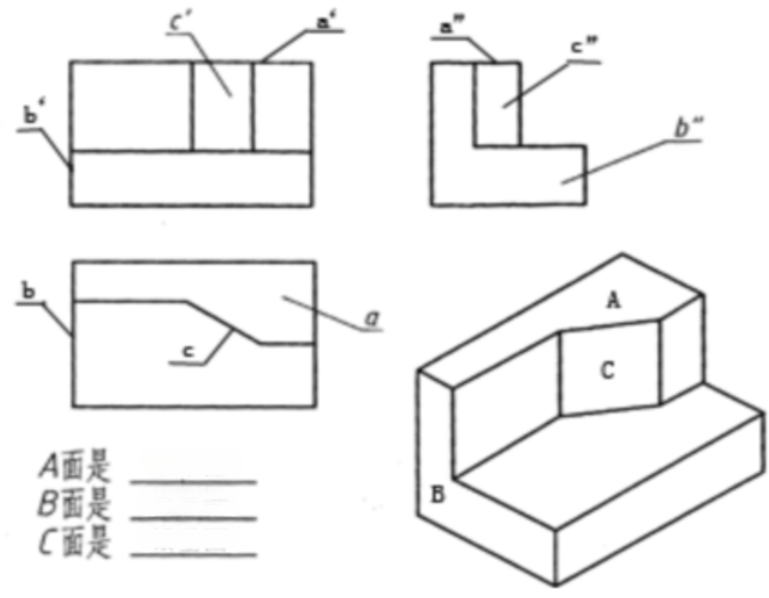 在立体图上标出各平面的位置(用相应的大写字母),并在投影图上标出指定平面的其它两个投影。并判定其为何种位置平面。 (1)